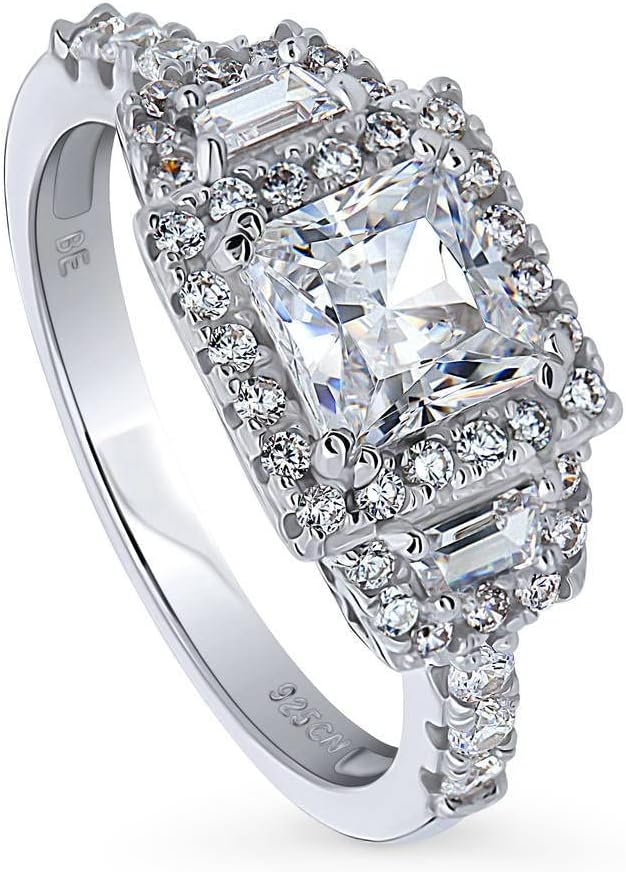 Celebrate your timeless love with our sterling silver 3-stone halo art deco ring. Perfect for wedding, engagement, or anniversary, it features a dazzling cubic zirconia in various princess, round, marquise, cushion, pear, and asscher cuts. Crafted with fine 925 sterling silver. Set with premium grade cubic zirconia CZ. Imported.DISCLAIMER: CZ carat weights are approximate and provided as diamond equivalents. Intended for adult women.