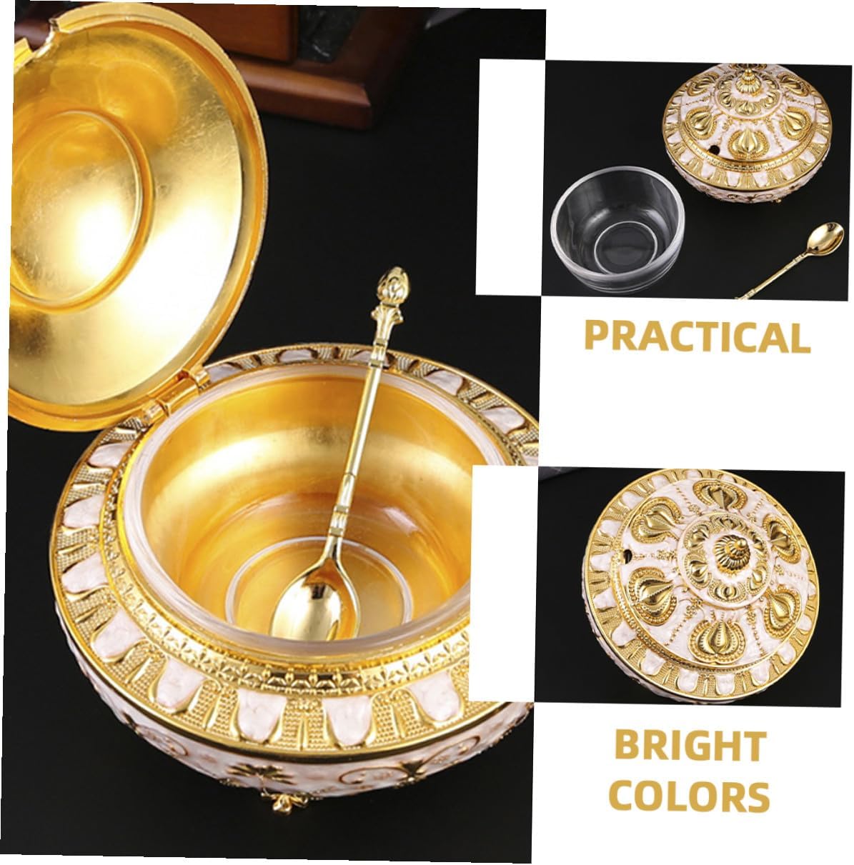 Package Include 1 x Spice Jar Features -Size:13.70X13.70X11.50cm/5.38X5.38X4.52in -Product Info:Tulip jar -Material:Metal -Color:Golden -The spice container is made of reliable materials, stylish and beautiful in appearance, the spice container is sturdy and and odorless. -Convenient spice box has good toughness and hardness for direct contact with food spices jars. -The spice container is neatly arranged, organized and clear , and the spices inside are salt container holder. -Good airtightness, food is not easy to get bad. Keeps spices fresh for longer. Packaging is safe, secure and convenient countertop seasoning containers. -Multi-functional Spice Container lid type design, save effort when opening and closing. Good sealing performance spice jars with lids.Goods Descriptionspice containers This item is a multipurpose Seasoning Box with retro design.spice container You can store salt, pepper, chili, sauces, sugar and other condiments.seasoning dispenser jar One hand press, easy to use, one hand can open the lid, cooking is .salt container Suitable for home, hotel, café, buffet, party, etc.condiment pot You can feel the convenience of life while using this seasoning jar