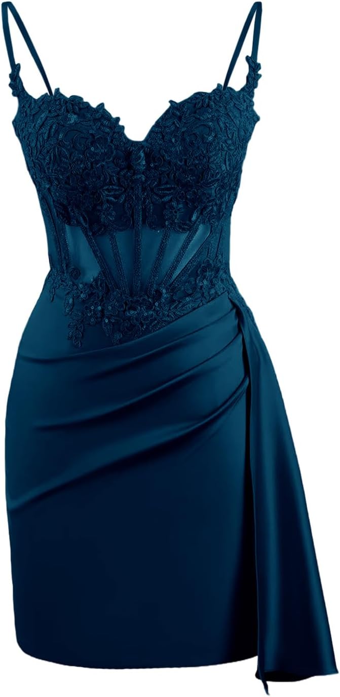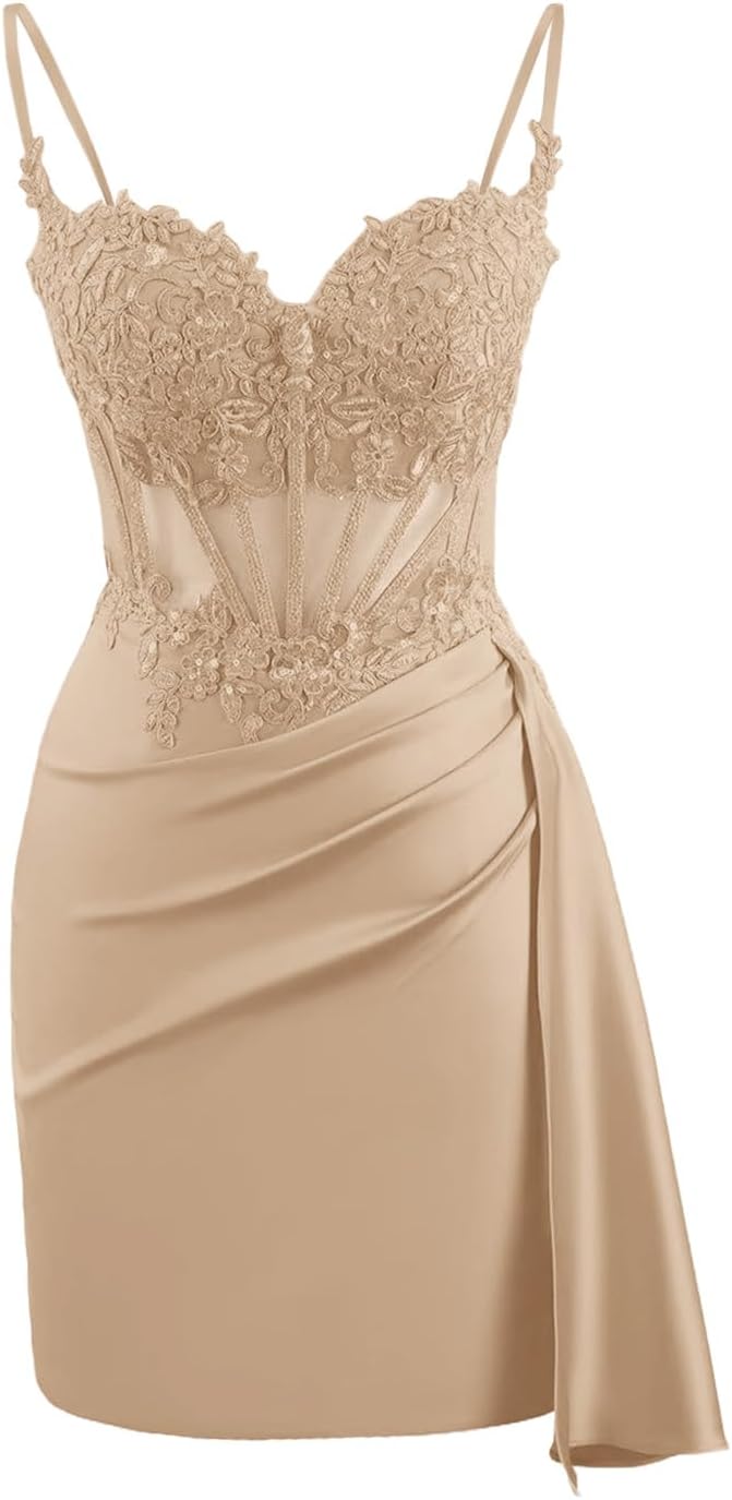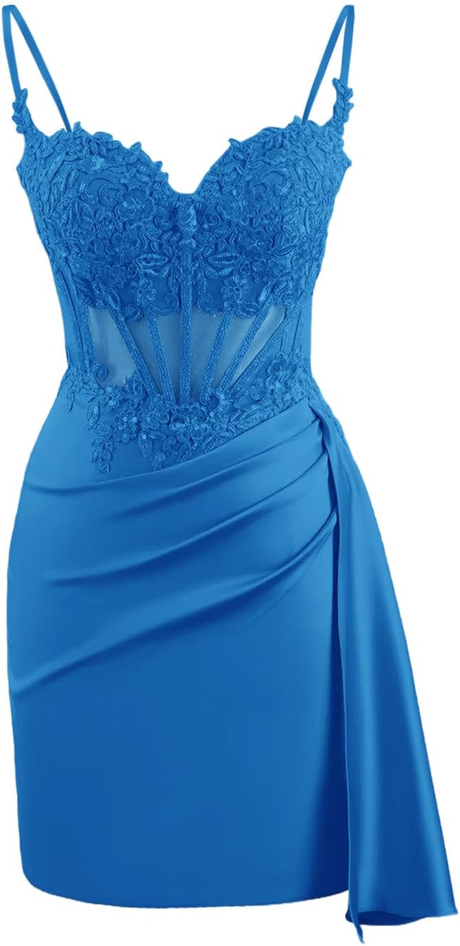 Item Description: This sleeveless spaghetti strap satin tight dress is very cute and comfortable. The fabric is satin with soft and straight features, which is mostly used in women's special occasion dresses such as Homecoming,Formal,Prom,Bridesmaid,Cocktail,Evening,Party,Wedding Custom Made: Dresses can be made according to your measurements with no more charges,the measurements we need is:1.Bust 2.Waist 3.Hips 4.Hollow(or Shoulder) to Hem. after you place the order,please send us your measurements and order id Product Name: Spaghetti Straps Satin Homecoming Dresses Short Tight Prom Cocktail Party Dress with Lace Appliques Occasion:Homecoming Bridesmaid Prom Cocktail Party Wedding Evening Item Type:Satin Homecoming Dress,Spaghetti Straps Short Prom Dress,Tight Cocktail Dress Waistline:Natural Decoration:Ruched Fabric Type:Satin Back:Lace up Train:No Dresses Length:Above Knee Silhouette:Sheath Neckline:Spaghetti Straps Sleeve Length:Sleeveless