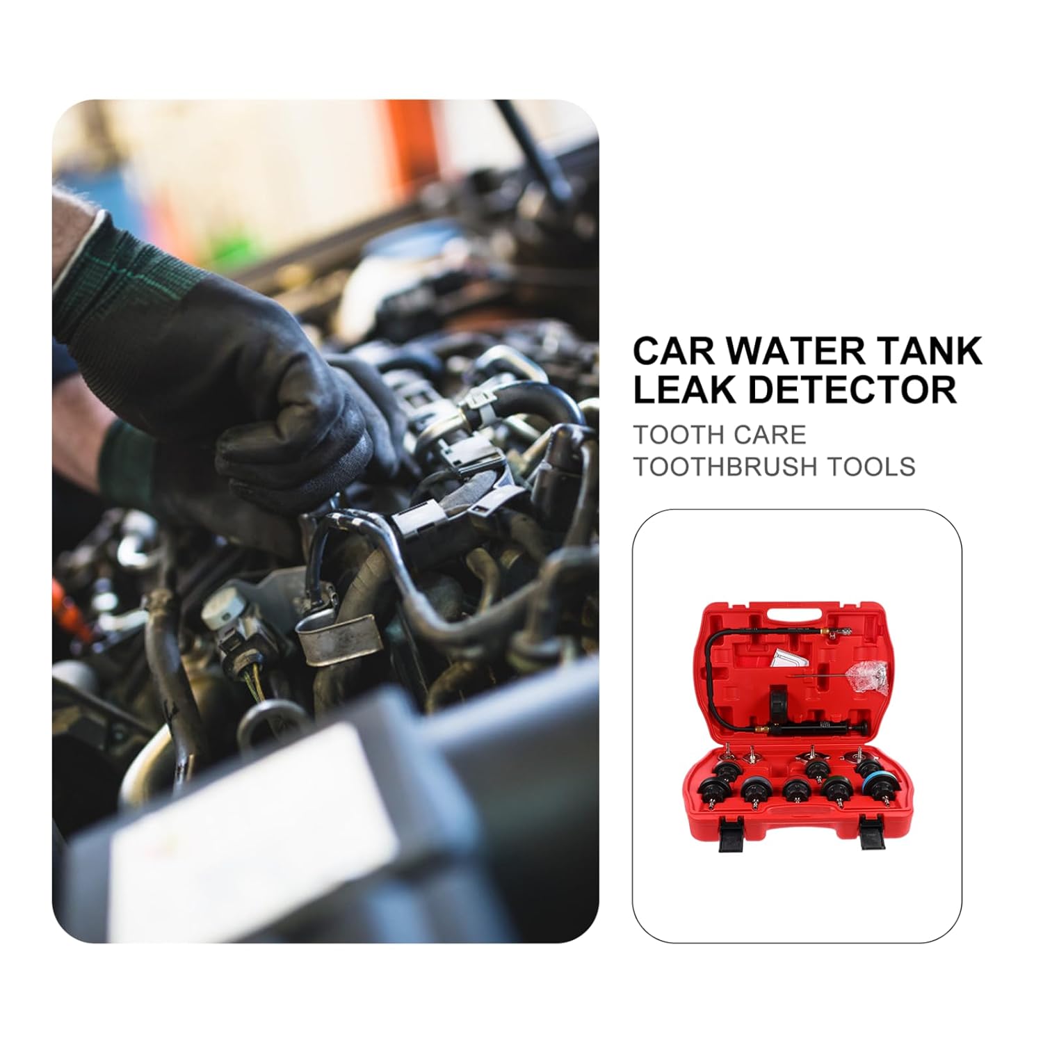 Package Include 8 heads 1 x thermometer 1 x water tank tester 4 connectors Characteristics -Product Info:Water tank detector -Size: 44.00X31.00X8.50cm/17.29X12.18X3.34in -Material: rubber, nylon, metal, aluminum alloy -Color: As Shown - A variety of specifications of thecoolant cover is suitable for a variety of different car models car radiator pressure tester. - workmanship, reasonablestructure, professional and practical, can bring you convenience car water tank tester. - Accurate measurement of precisionmachining and convenient connection and good sealing pressure testing kit. - Nylon test head is lightweight andsturdy, metal connector is and durable coolant leak tester kit. - A practical car water tank detector totest which part of the water tank is leaking coolant pressure tester kit.Goods Informationwater pressure tester It is not easy to getdeformed and bring you much convenience.pressure testing kit Adopted of premiummaterial, it is practical and durable for long time use.coolant pressure tester If you are looking for a professional andaffordable automotive cooling system leak detector set, then your research isover here.cooling system pressure tester kit That's because our product can meet your need