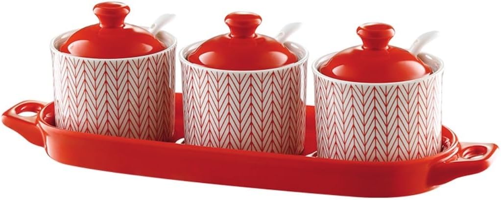 MAKE DINING MORE ENJOY!! Product name: Seasoning jar set/Condiment Container Set /Spice Container Set /seasoning bottle set Material: Ceramic Height including cover: 10cm Can body height: 7cm Tray size: 36cm*11.3cm*2.8cm Can mouth diameter: 9cm Product style: with lid + spoon + tray Packing List:1* seasoning bottle set Functional: Simple design,spices container set easy to clean,can be used to store sugar cubes,creamer,salt,pepper,etc. Multi-scene application: It is suitable for all kinds of scenes - family, hotel, cafe, party, restaurant with the elegant white porcelain and simple design. It is also suitable as a housewarming gift for your friends.